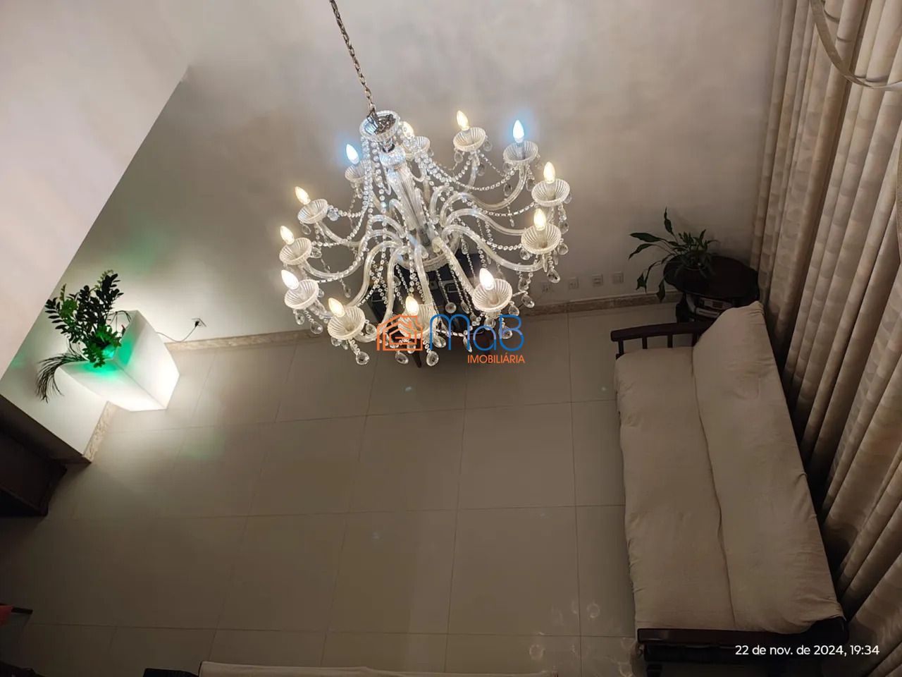 A sala principal é um verdadeiro espetáculo, com pé direito duplo e mezanino. Um janelão vertical de vidro proporciona iluminação natural abundante, enquanto o lustre pendente de cristal adiciona um toque de elegância. A climatização potente garante conforto em todas as estações.