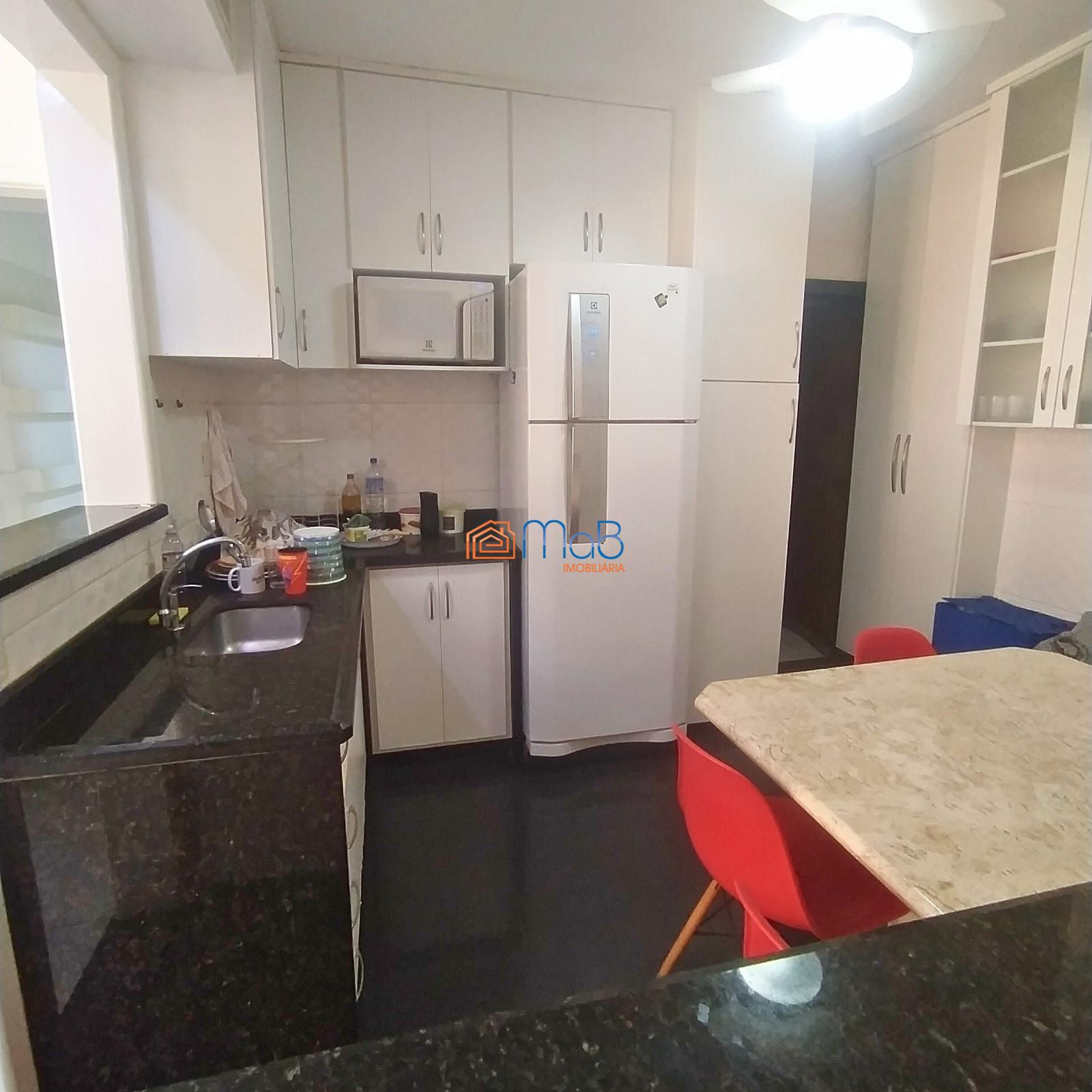 Cozinha com bancada em mármore, armário, microondas, Fogão, geladeira, adega;